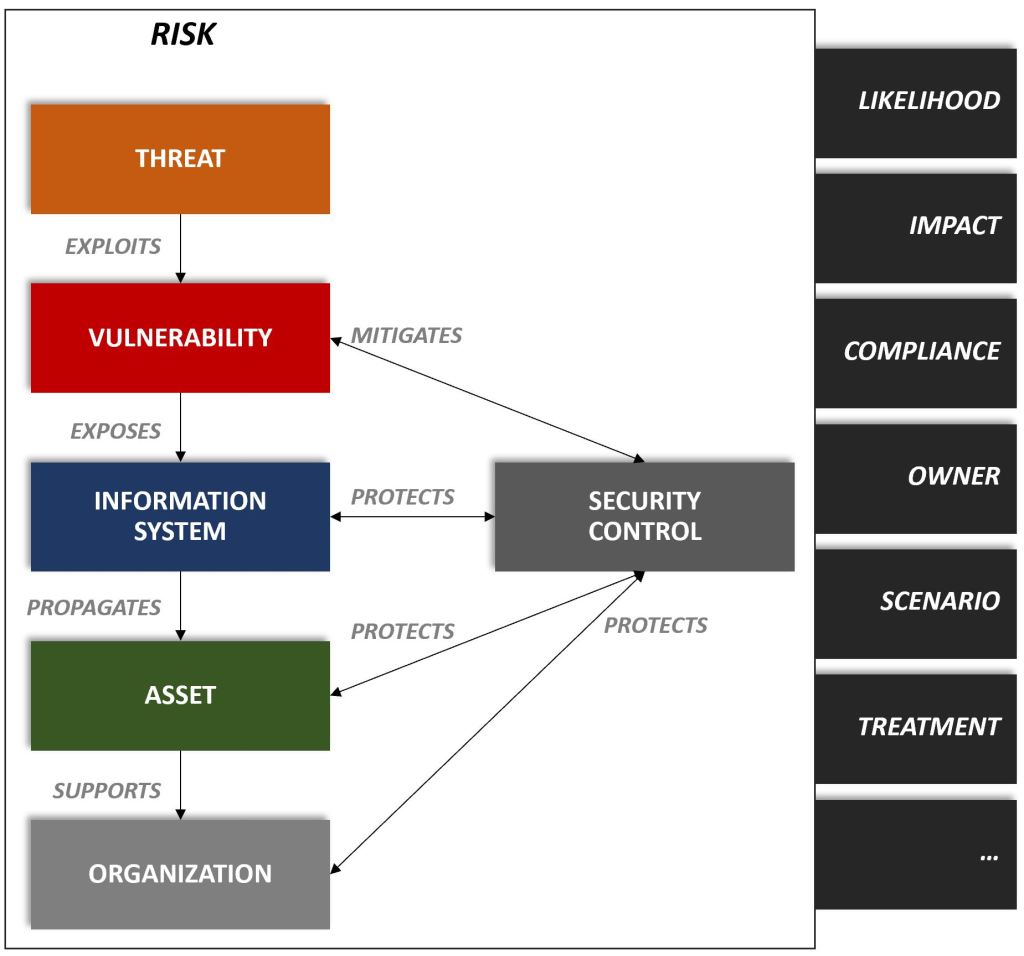 To exemplify them in the model let us assume an external adversarial Threat actor, i.e. cyber criminal, exploits a vulnerability in an information system. The vulnerability exposes the information system and propagates the exposure to its Asset(s).