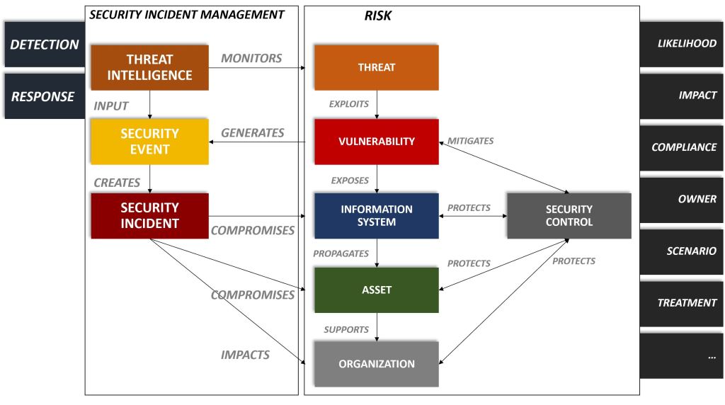 Threat Intelligence is used as input to security events that are generated from vulnerabilities. A positive security event creates a security incident, which signals that the information system, asset, and organization has been compromised and impacted.