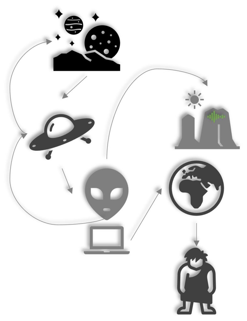 They levitate back into the spacecraft and warp back into their own dimension. At a top of a mountain, in the desert in the middle of f-ing nowhere, they leave a secret and encrypted message. We as humans do not manage to put our brains together to understand what it means. The message is written in the Aliens language and we do not hold the capabilities to decipher it. But we clearly see it, written in green neon text. It is the only piece of technology left on planet Earth carved into a mountaintop. The message is the answer to all mysteries and questions of mankind.